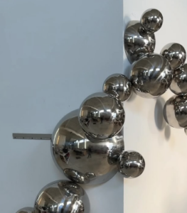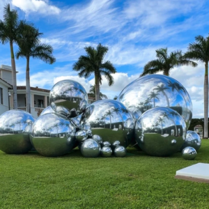 His signature, playful works made of reflective steel spheres capture the symmetry, volume and balance present in both nature and design. These spheres are placed together to create new forms that reflect the vibrant and dynamic nature of the world around us, and the impact of our ever-changing perspective. Kolodny’s site-specific and shapeshifting installations construct a kinetic and immersive environment for viewers, creating space for moments of mindfulness and self-reflection within their experience. Transcending the traditional boundaries of art, the artist creates new worlds with each installation, that are at once both fantastical and organic. His practice seeks to encourage viewers to engage with the world around them in new, more meaningful and imaginative ways, inspiring a childlike wonder.